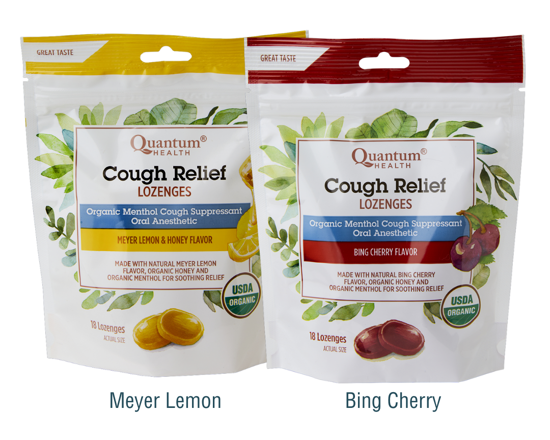 Quantum Health’s cough relief comes in two delicious flavors, Bing Cherry and Meyer Lemon with Honey. When you need to soothe your throat and quiet your cough, choose a cough drop that contains only good-for-you ingredients.