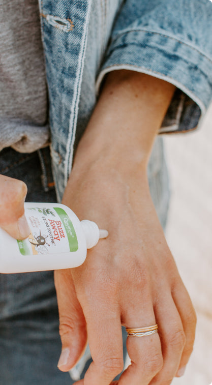 Vous avez oublié votre Buzz Away Extreme® ? Vous n'avez plus de spray anti-piqûres d'insectes pendant le camping ? Nous connaissons cette sensation de démangeaison. C'est pourquoi nous avons formulé Buzz Away Sting Soothe®. Le mélange unique d'herbes calme les piqûres d'insectes et les piqûres rapides ! L’ingrédient actif, le menthol, soulage rapidement la douleur et les démangeaisons causées par les piqûres et piqûres d’insectes. La formule comprend également plus d'une douzaine d'ingrédients apaisants pour la peau, tels que l'aloès, l'extrait d'ortie, l'huile de feuille de girofle et le camphre. Que vous recherchiez un meilleur spray anti-piqûres d'insectes ou que vous cherchiez simplement à compléter votre trousse de premiers soins, essayez Buzz Away Sting Soothe® dès aujourd'hui !